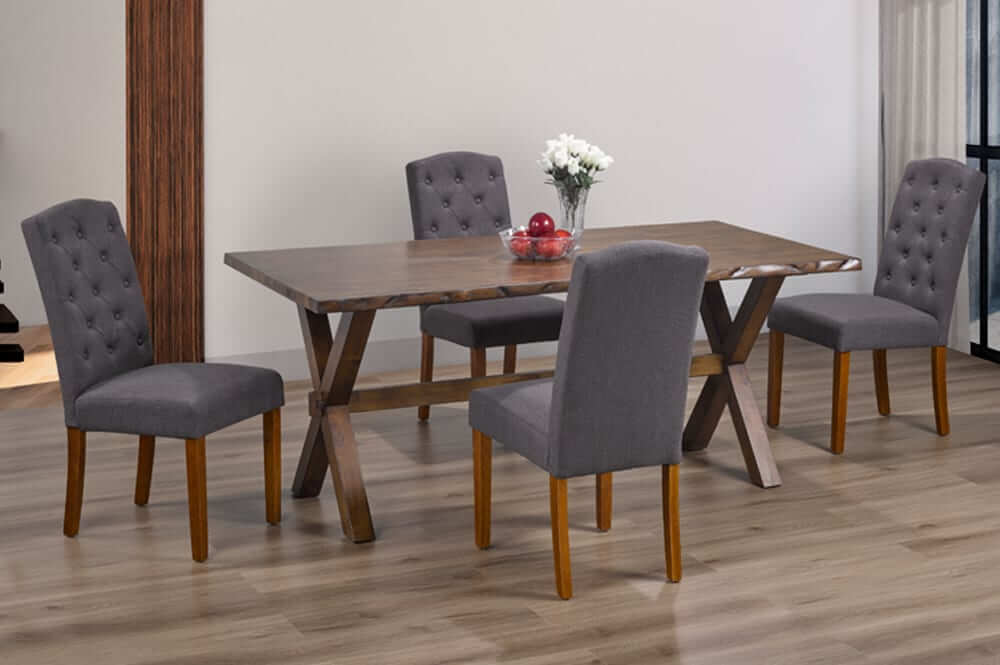Impress your guests and make every dining occasion memorable with this 5-piece dining set. The combination of an impressive live edge table design, high gloss finish, luxurious button-tufted chairs, and a choice of charming linen fabric options will elevate your dining area to new heights of style and sophistication.