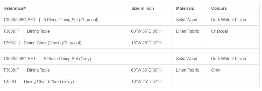 Choose between two stunning options: charcoal or grey linen fabric. Both choices offer a touch of elegance and versatility, allowing you to match your dining set with your preferred decor style.