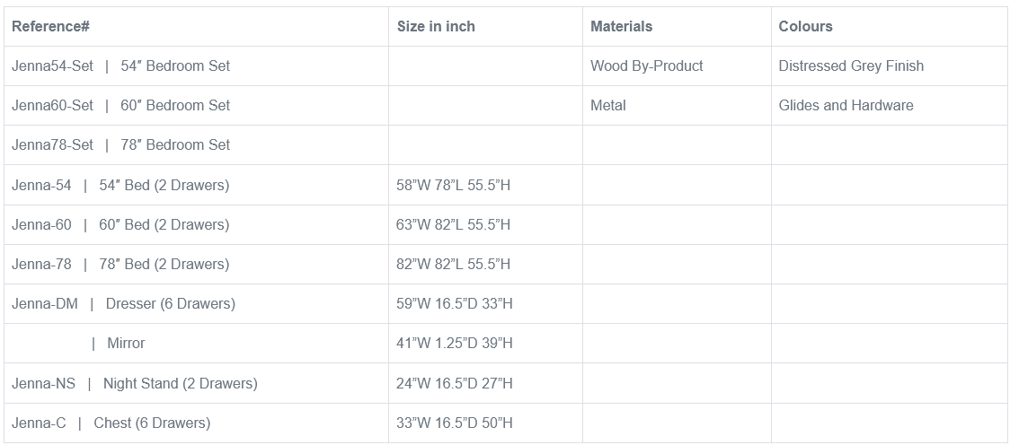 The Jenna Contemporary Bedroom Set is graced with an elegant distressed grey finish, adding a touch of vintage sophistication to your personal retreat. This unique finish creates a warm and inviting ambience, making your bedroom a sanctuary of style.