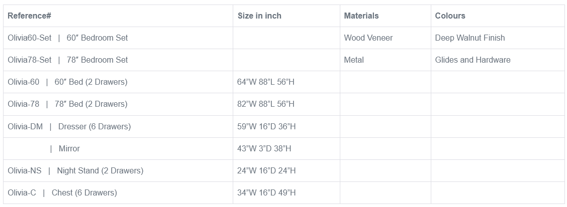 The Olivia Walnut Haven Bedroom Set pays attention to every detail. Each piece includes unique bevelled corners and stylish chrome pulls, adding a distinctive touch that sets it apart. This thoughtful design ensures that your bedroom is not only functional but also impressively stylish.