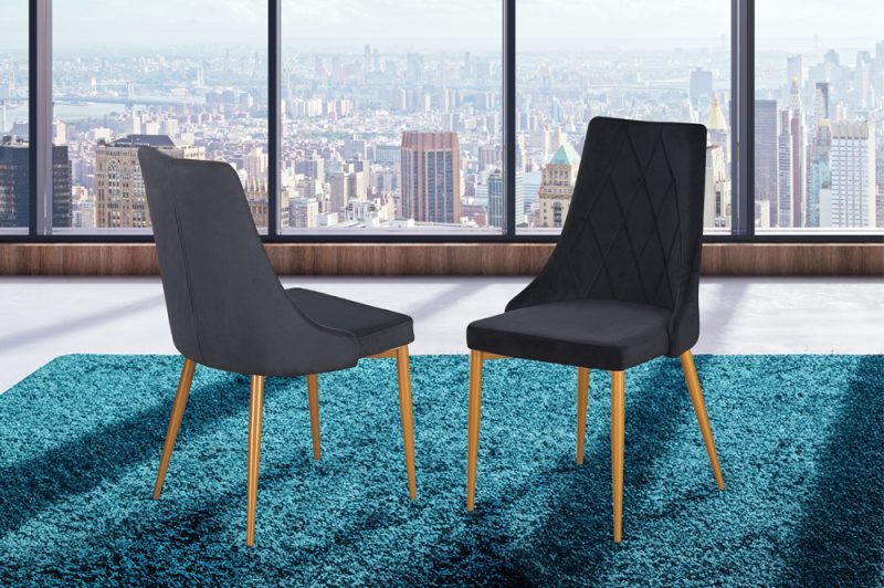 You can choose your fabrics! Pick from our blue or black velvet fabric that provides an eye-catching contrast, adding a captivating “pop” to your room’s aesthetic or a white leatherette that adds glam to your dining room. These chairs are more than just furniture; they’re a work of art.